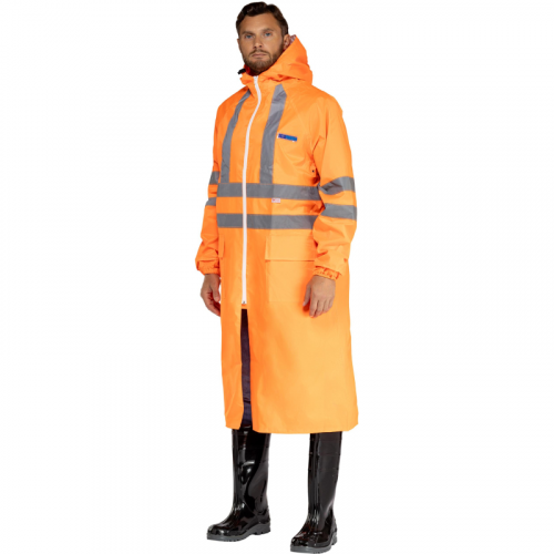 Плащ влагозащитный Extra-Vision WPL ПВХ на молнии оранжевый с СОП (размер 48-50, рост 170-176)Влагозащитный плащ с центральной застежкой на молнию оснащен двумя накладными карманами и регулируемым капюшоном с кулиской для комфортной посадки. Оранжевый цвет изделия дополнен светоотражающей полосой шириной 50 мм, обеспечивающей видимость в темное время суток. Все швы плаща загерметизированы специальной лентой, что усиливает защиту от влаги.Изготовлен из прочной плащевой ткани с ПВХ-покрытием, плотность ткани составляет 225 г/кв.м. Водоупорность плаща - не менее 5000 мм водяного столба. Это изделие соответствует европейским стандартам по содержанию вредных веществ, что подтверждает его экологическую безопасность. Коллекция непромокаемой одежды Extra-Vision включает костюмы (куртка и брюки) Extra-V-КБР и плащи Extra-V-ПЛ, доступные в неоновой оранжевой и лимонной цветовой гамме с отделкой светоотражающими полосами.Защитные свойства:- Со - одежда сигнальная повышенной видимости (3 класс защиты);- Вн - одежда водонепроницаемая (3 класс защиты).Тип силуэта - свободный, не стесняющий движений. Карманы накладные, расположены на передней части. Капюшон с регулировкой объема. Связка швов усилена для лучшей износостойкости. Световозвращающие элементы повышают видимость в условиях плохой освещенности.Стандарты: ГОСТ 12.4.281-2014, ТР ТС 019/2011, ГОСТ Р 12.4.288-2013. Рекомендации по уходу: стирка при температуре не выше 30C, не использовать отбеливатели, не гладить. target="_blankПодобрать размерЦвет на изображении товара в интернет-магазине или в печатном каталоге может отличаться от оригинала из-за особенностей цветопередачи.