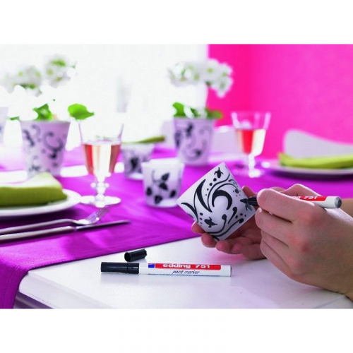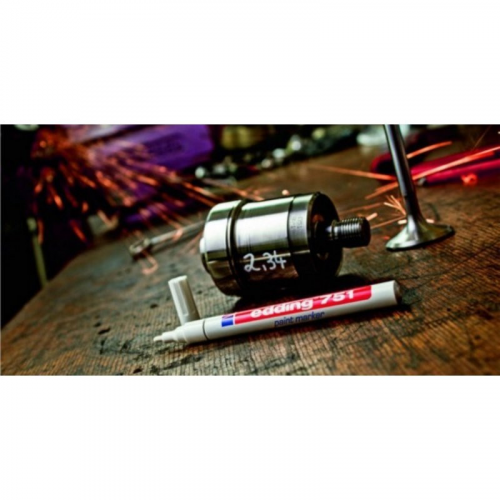 Универсальный маркер Edding 751 используется для промышленной непрозрачной маркировки практически всех материалов, например, стекла, пластика, дерева или металла. Может применяется для письма на жирных, пыльных, грязных поверхностях в индустриальных условиях. Лаковый маркер устойчив к кислотам, растворителям, механическому истиранию, свету. Высококонцентрированный пигмент хорошо ложится на гладкие и шероховатые поверхности. Не содержит толуола и ксилола. Специальные добавки, введенные в состав маркера Edding E 751, растворяют масляную пленку на поверхности письма, что дает яркую устойчивую надпись. Непрозрачные лаковые чернила позволяют делать хорошо заметные надписи густым плотным слоем даже на темных поверхностях. Корпус промышленного маркера изготовлен из алюминия. Маркер Edding E 751 имеет упроченный круглый (пулевидный) наконечник. Наконечник маркера может быть заменен по мере истирания. Благодаря тонкому наконечнику маркером может наносится маркировка на небольшие элементы и поверхности. Толщина линии - 1-2 мм. Поток чернил регулируется клапаном. Чернила маркера с лакирующим эффектом на основе нитрокраски. Водостойкий, быстро сохнет. Термостойкость надписи до 1000 градусов по Цельсию. Надписи цветами 05-010, 049 также видимы до 1000 С. Надписи, сделанные маркерами других цветов термостойки до 400 градусов по Цельсию. Маркер Edding E 751 хорошо зарекомендовал себя в работе при перепадах температур от -15 до 30. Промышленный лаковый маркер Edding Е-751 универсален. Используется, например, при нанесении меток на разнородные материалы. При маркировке изделий из резины, пластика, стекла, металла, кабеля, проводов, при нанесении маркировки на товары достаточно одного маркера - Edding E 751. Идеально подходит для маркировки грузов, приборостроения, технологической маркировки. Кроме того, маркер Edding E 751, благодаря разнообразной палитре цветов и свойствам красящего вещества, широко используется для декоративных и оформительских работ дизайнерами. используется в витражных работах, росписи по дереву и керамике, для других интерьерных работ. Инструкция по применению маркера: 1. Перед использованием хорошенько встряхнуть с закрытым колпачком. 2. Снимите колпачок, прижмите наконечник к поверхности, надавите и удерживайте пока не проступит краска. 3. Применять после того как убедитесь, что вытекает исходный цвет. Предостережение: плотно закрывайте колпачок после применения, держать маркер вдали от огня и прямых солнечных лучей.