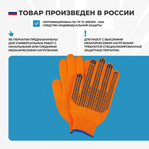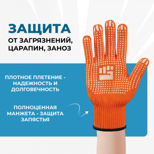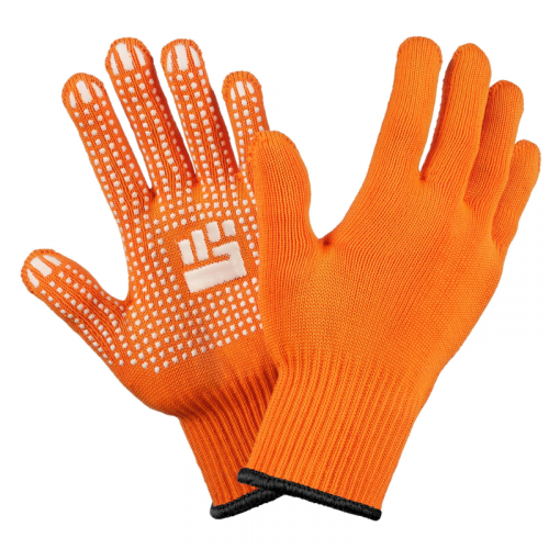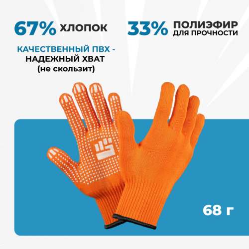 Перчатки рабочие защитные трикотажные с ПВХ покрытием оранжевые (6 нитей, 10 класс, универсальный размер). Рабочие перчатки оранжевого цвета с 6 нитями и 10 классом вязки предназначены для защиты рук от загрязнений и механических повреждений. Универсальный размер подходит для большинства пользователей. Эти перчатки применяются в строительной, нефтегазовой, производственной и других отраслях, где требуется защита от общих загрязнений и механических воздействий.Перчатки изготовлены из качественной индонезийской пряжи с добавлением прочных синтетических волокон. Внутренний слой из х/б пряжи обеспечивает комфорт при длительной работе и снижает нагрузку на руки. Внешний слой из полиэфира повышает износостойкость перчаток, делая их в несколько раз более долговечными. ПВХ покрытие увеличивает срок службы перчаток и защищает от быстрого изнашивания.Состав: 67% хлопок, 33% полиэфир. Манжета: резинка. Количество в упаковке: 1 пара. Количество упаковок в транспортной коробке: 200. Товар доступен в двух вариантах дизайна (без возможности выбора). Цвет на изображении товара в интернет-магазине или в печатном каталоге может отличаться от оригинала из-за особенностей цветопередачи монитора.ЗАКОНОДАТЕЛЬНЫЕ И ТЕХНИЧЕСКИЕ ДОКУМЕНТЫ: