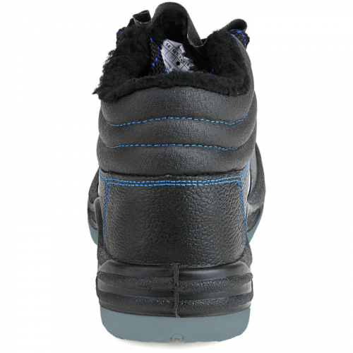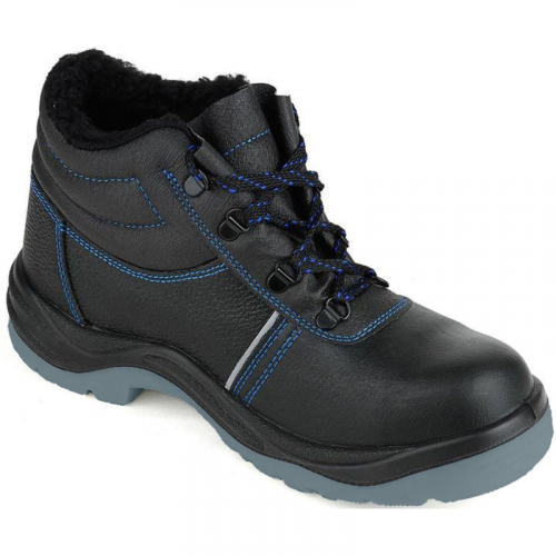 Ботинки рабочие выполнены в чёрном цвете. Размер 46. Унисекс. Обувь рекомендована к использованию в строительстве, озеленении территории, ЖКХ, промышленности, логистике, нефтегазовой промышленности. Верх ботинок из искусственной кожи. Подкладка ботинок из искусственного меха. В верхней части выполнен мягкий кант. Ботинки завязываются на шнурки и имеют глухой клапан. Шнуровка с использованием металлических люверсов. На глухом клапане мягкая вставка из поролона. В носочной части стопы внутренний защитный подносок из металла ударной прочностью 200 Дж. На боковинах световозвращающие элементы в виде полосок. Выполнена контрастная отстрочка синего цвета в тон подкладки и цветной нити на шнурках. Подошва двухслойная (ПУ/ТПУ), есть внутренняя амортизирующая вставка в пяточной части подошвы. Глубина профиля ходового слоя подошвы составляет 3.5 мм. Ботинки изготовлены методом литья промежуточного слоя подошвы из полиуретана к заготовке верха обуви. На промежуточный слой из полиуретана прилит ходовой слой из термопластичного полиуретана со стойкостью к деформациям и истиранию. Имеется пристроченная прилитая задинка. Стелька вкладная. Соответствуют стандартам ГОСТ 12.4.187, ГОСТ 28507, ТР ТС 019/2011. Защищают от общих производственных загрязнений, механических воздействий, ударов, кислот и щелочей, нефти и нефтепродуктов, от контакта с нагретой поверхностью, а также, от пониженных температур. Цвет на изображении товара в интернет-магазине или в печатном каталоге может отличаться от оригинала из-за особенностей цветопередачи монитора. Законодательные и технические документы