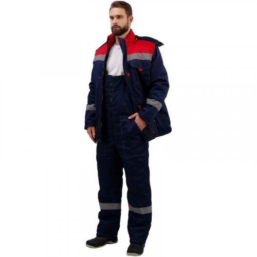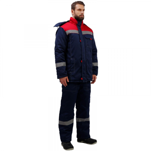 Костюм рабочий зимний мужской з31-КПК с СОП синий/красный (размер 52-54, рост 182-188). Рекомендован для использования в сельском хозяйстве, логистике, легкой промышленности, строительстве, озеленении. Изготовлен из смесовой ткани (65% полиэстер, 35% хлопок), плотность ткани - 210 г/кв.м. Утеплитель из синтепона, плотностью - 360 г/кв.м (основа) 3 слоя по 120 г/кв.м и 240 г/кв.м (руки/ноги) 2 слоя по 120 г/кв.м. Технология изготовления термоскрепленного синтепона (евросинтепона) позволяет использовать данный утеплитель для создания более тонких изделий с сохранением термозащитных свойств. Важными преимуществами утеплителя являются легкость и хорошая пластичность, что улучшает подвижность в костюме. А также исключение миграции волокна через ткани верха и подкладки за счет скрепления слоев. Материал подкладки - 100% полиэстер. Данная модель костюма предназначена для носки при температуре до -18°C. Защитные свойства: -Защищает от общих производственных загрязнений. -Защищает от пониженных температур. Костюм серого цвета с красными вставками и контрастной отстрочкой. Светоотражающая полоса размещена на груди, спине, рукавах, а также внизу полукомбинезона. Куртка с центральной застежкой на молнию, ветрозащитным клапаном, съемным капюшоном, имеет два нижних внутренних кармана и один верхний накладной, трикотажные напульсники. Полукомбинезон классического покроя с центральной молнией, с двумя нижними накладными карманами. Костюм обеспечивает защиту от пониженных температур и производственных загрязнений. Стандарты: ГОСТ 12.4.303-2016. Костюмы, состоящие из куртки и полукомбинезона, из коллекции зимней спецодежды з31 представлены в нескольких цветовых сочетаниях: серый с контрастной отделкой красного цвета и синий, с аналогичной красной отделкой. размер Цвет на изображении товара в интернет-магазине или в печатном каталоге может отличаться от оригинала из-за особенностей цветопередачи монитора.
