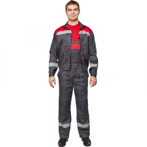 Спецодежда летняя костюм мужской л20-КПК (52-54, 182-188), состоит из куртки и полукомбинезона. Изготовлен из смесовой ткани (65% полиэстер, 35% хлопок). Плотность ткани: 210 г/кв.м. Полукомбинезон c накладными карманами, гульфиком на пуговицах, эластичной тесьмой по талии спинки и регулируемыми бретелями. Куртка прямого силуэта c объемными накладными карманами и супатнoй застежкой на пуговицы. Куртка и полукомбинезон оснащены светоотражающей полосой. Защитные свойства: Ми - защита от механических воздействий: истирания; З - защита от общих производственных загрязнений. Сферы применения: сельское хозяйство, логистика, легкая промышленность, строительство, озеленение. ГОСТ 12.4.280-2014, ТР ТС 019/2011.
