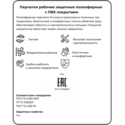 Перчатки рабочие защитные полиэфирные с ПВХ покрытием черные (точка, 15 класс, размер 9-11, L-XXL, 12 пар в упаковке, nl11pd). Предназначены для использования в промышленных работах, логистике, на складах, в сфере услуг ЖКХ, сельском хозяйстве, строительстве, ремонте и электроэнергетике. Перчатки также подходят для использования в транспортной сфере и в условиях сухой рабочей среды.Перчатки выполнены из полиэфирного трикотажа с манжетой-резинкой. Ладонь покрыта ПВХ, что обеспечивает превосходный захват и оптимально подходит для работы с мокрыми и скользкими поверхностями. ПВХ покрытие также увеличивает прочность и защищает от механических воздействий и загрязнений.Размер: 9-11, L-XXL. Количество в упаковке: 12 пар. Перчатки соответствуют стандартам: ГОСТ 12.4.252-2013, ТР ТС 019/2011, ГОСТ 12.4.183-91.Цвет на изображении товара в интернет-магазине или в печатном каталоге может отличаться от оригинала из-за особенностей цветопередачи монитора.ЗАКОНОДАТЕЛЬНЫЕ И ТЕХНИЧЕСКИЕ ДОКУМЕНТЫ: