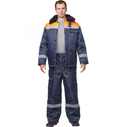 Куртка рабочая зимняя мужская з32-КУ с СОП синяя/оранжевая из ткани оксфорд (размер 68-70, рост 182-188). Куртка предназначена для защиты работающих от пониженных температур в различных отраслях промышленности (сельское хозяйство, логистика, легкая промышленность, строительство), а также производственных загрязнений. Изготовлена из материала Оксфорд (100% полиэстер) плотностью 90 +/- 5 г/кв.м. Утеплитель - синтепон плотностью 360 г/кв.м (основа) 3 слоя по 120 г/кв.м и 240 г/кв.м (руки) 2 слоя по 120 г/кв.м. Технология изготовления термоскрепленного синтепона (евросинтепона) позволяет использовать данный утеплитель для создания более тонких изделий с сохранением термозащитных свойств. Важными преимуществами утеплителя являются легкость и хорошая пластичность, что улучшает подвижность в костюме. А также исключение миграции волокна через ткани верха и подкладки за счет скрепления слоев. Материал подкладки - 100% полиэстер. Защитные свойства: - Защищает от общих производственных загрязнений. -Защищает от пониженных температур. Светоотражающая полоса шириной 5 см размещена спереди, сзади между кокеткой и нижней частью куртки, а также на рукавах. Куртка прямого силуэта, удлиненная, с центральной бортовой супатной застежкой на 5 петель-пуговиц. Полочка отрезная по линии кокетки. Наличие двух нижних накладных карманов с косым срезом и наличие одного накладного нагрудного кармана с клапаном с двойной контрастной отстрочкой. Низ куртки обработан швом в подгибку с закрытым срезом. По линии талии настрочена кулиса со сквозным выходом наизнанку, регулируется шаровым фиксатором и шнуром. Спинка прямая, отрезная по линии кокетки. Рукав прямой, втачной, одношовный. Внутри рукава по нижней части на подкладку притачан трикотажный манжет. Воротник меховой, спереди застегивающийся на пуговицу. Изготавливается в соответствии с ГОСТ 12.4.303-2016, ТР ТС 019/2011. Коллекция зимней спецодежды з32 представлена в двух видах ткани - смесовой с влагоотталкивающей пропиткой и Оксфорд. К куртке з32-КУ из ткани Оксфорд подходят брюки з32-БР из аналогичной ткани.