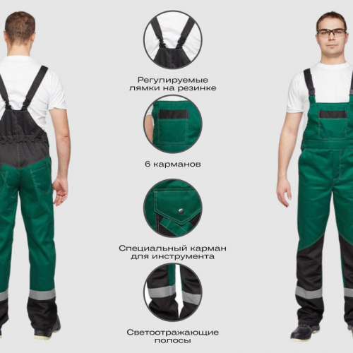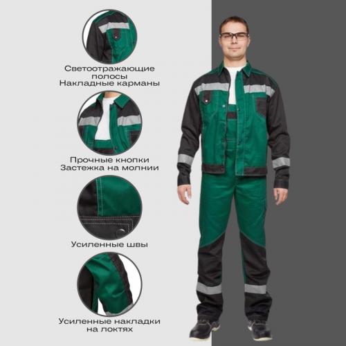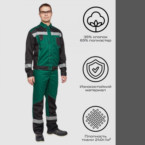 Костюм рабочий летний мужской л21-КПК КОС212 с СОП зеленый/черный (размер 52-54, рост 170-176). Коллекция спецодежды л21 представляет собой надежное решение для защиты от общих производственных загрязнений и от механических повреждений, от истирания. Костюм мужской л21-КПК состоит из куртки и полукомбинезона. Идеально подходит для использования в сельском хозяйстве, логистике, легкой и тяжелой промышленности, а также в строительстве. Костюм изготовлен из смесовой ткани с водоотталкивающей пропиткой (ВО), состоящей на 65% из полиэстера и на 35% из хлопка. Плотность материала составляет 235 г/кв.м. Такая комбинация обеспечивает высокую износостойкость и комфорт при носке. Материал не имеет специальной пропитки, но его структура обеспечивает достаточную защиту от загрязнений. Защитные свойства: - З - защита от общих производственных загрязнений. Куртка имеет прямой силуэт и регулируется по фигуре с помощью кнопок на поясе. Застегивается на молнию и кнопки. На куртке два верхних накладных кармана. Рукава снабжены налокотниками и манжетами, что повышает комфорт и долговечность изделия. Полукомбинезон также имеет прямой силуэт и застегивается на пуговицы. Впереди расположены два накладных кармана со скошенным входом и один верхний накладной карман. Сзади полукомбинезон имеет два накладных кармана, один из которых на кнопке, а также боковой накладной карман на кнопке. Светоотражающие полосы шириной 50 мм размещены на груди, спине, рукавах и внизу полукомбинезона, обеспечивая хорошую видимость в условиях недостаточной освещенности. Рекомендации по уходу: для продления срока службы изделия рекомендуется соблюдать инструкции по стирке и уходу, указанные на этикетке. Стандарты: ГОСТ 12.4.280-2014, ТР ТС 019/2011. Коллекция спецодежды Премиум-класса л21 выполнена в стильном, функциональном дизайне, в широкой цветовой гамме. Костюмы, представленные в ней, предназначены для защиты от общих производственных загрязнений и от механических повреждений, от истирания. Рекомендуется для инженерно-технических работников. Цвет на изображении товара может отличаться от оригинала из-за особенностей цветопередачи монитора.ЗАКОНОДАТЕЛЬНЫЕ И ТЕХНИЧЕСКИЕ ДОКУМЕНТЫ: