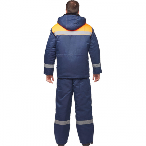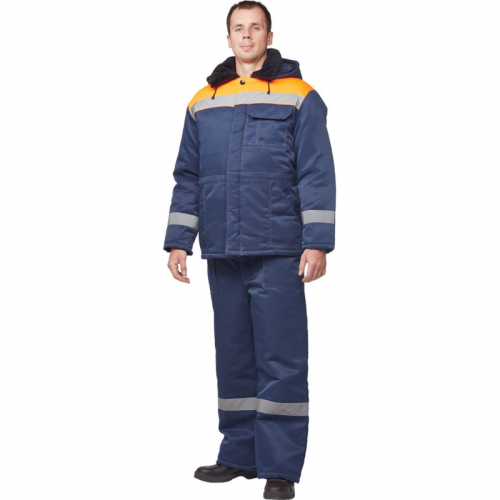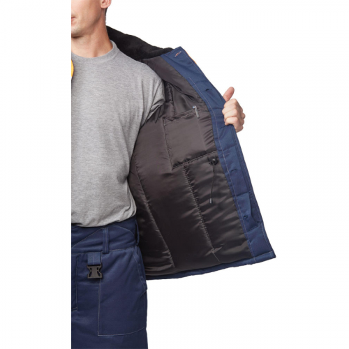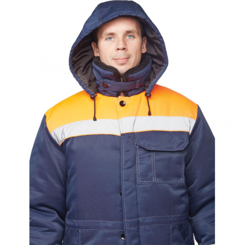 Куртка рабочая зимняя мужская з32-КУ с СОП синяя/оранжевая из ткани грета (размер 68-70, рост 182-188). Рекомендуется для использования в ЖКХ, озеленении территории, строительстве, проведении ремонтных работ, промышленности, логистике, сельском хозяйстве. Изготовлена из смесовой ткани (тип 3) - 80% полиэстер, 20% хлопок с водоотталкивающей пропиткой. Плотность ткани: 190 г/кв.м. Такой материал обладает улучшенными эксплуатационными характеристиками. Благодаря высокой плотности он непроницаем для пыли, отличается высокой износостойкостью. Сохраняет яркий цвет. Утеплитель - синтепон плотностью 360 г/кв.м (основа) 3 слоя по 120 г/кв.м и 240 г/кв.м (руки) 2 слоя по 120 г/кв.м. Технология изготовления термоскрепленного синтепона (евросинтепона) позволяет использовать данный утеплитель для создания более тонких изделий с сохранением термозащитных свойств. Важными преимуществами утеплителя являются легкость и хорошая пластичность, что улучшает подвижность в костюме. А также исключение миграции волокна через ткани верха и подкладки за счет скрепления слоев. Материал подкладки - 100% полиэстер. Защитные свойства: - Защищает от общих производственных загрязнений. - Защищает от пониженных температур. Светоотражающая полоса шириной 5 см размещена спереди, сзади между кокеткой и нижней частью куртки, а также на рукавах. Куртка прямого силуэта, удлиненная, с центральной бортовой супатной застежкой на 5 петель-пуговиц. Полочка отрезная по линии кокетки. Наличие двух нижних накладных карманов с косым срезом и наличие одного накладного нагрудного кармана с клапаном с двойной контрастной отстрочкой. Низ куртки обработан швом в подгибку с закрытым срезом. По линии талии настрочена кулиса со сквозным выходом наизнанку, регулируется шаровым фиксатором и шнуром. Спинка прямая, отрезная по линии кокетки. Рукав прямой, втачной, одношовный. Внутри рукава по нижней части на подкладку притачан трикотажный манжет. Воротник меховой, спереди застегивающийся на пуговицу. Капюшон отстегивается. Соответствует стандартам ГОСТ 12.4.303-2016, ТР ТС 019/2011. Коллекция зимней спецодежды з32 представлена в двух видах ткани - смесовая с влагоотталкивающей пропиткой и Оксфорд. К куртке з32-КУ из смесовой ткани подходят брюки з32-БР из аналогичной ткани.