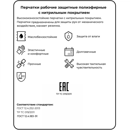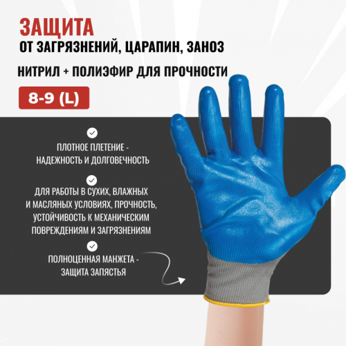 Перчатки рабочие защитные Oilresist lite полиэфирные с нитрильным покрытием серые/голубые (13 класс, размер 9, L, 12 пар в упаковке, nl13nt/12-541). Предназначены для использования в промышленных работах, сфере услуг, ЖКХ, логистике, на складах, в лабораториях, сельском хозяйстве и садовых работах. Перчатки подходят для работы в сухих, влажных и масляных условиях. Перчатки выполнены из трикотажа полиэфирного с манжетой-резинкой. Ладонь покрыта нитрильным латексом. Это покрытие защищает руки от механических воздействий и загрязнений, обеспечивая хороший захват в масляной и влажной среде. Размер: 9, L. Вес пары: 46-48 г. Количество в упаковке: 12 пар. Перчатки соответствуют стандартам: ГОСТ 12.4.252-2013, ТР ТС 019/2011, ГОСТ 12.4.183-91.Цвет на изображении товара в интернет-магазине или в печатном каталоге может отличаться от оригинала из-за особенностей цветопередачи монитора. ЗАКОНОДАТЕЛЬНЫЕ И ТЕХНИЧЕСКИЕ ДОКУМЕНТЫ: