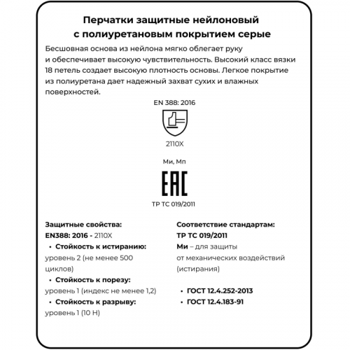 Перчатки защитные Scaffa Контакт PU1850T-GR нейлоновый с полиуретановым покрытием серые (18 класс, размер 8, M). Перчатки предназначены для использования при строительных работах, работе с инструментом и общехозяйственных работах.Бесшовная основа из нейлона мягко облегает руку, обеспечивая высокую чувствительность. Высокий класс вязки (18 петель на дюйм) создает высокую плотность основы. Легкое полиуретановое покрытие обеспечивает надежный захват сухих и влажных поверхностей. Перчатки комфортны при длительном ношении. Удлиненный манжет напульсник мягко облегает запястье, предотвращая попадание мусора и вредных веществ внутрь перчатки.Перчатки рекомендуется использовать в сферах промышленных работ, логистики, на складах, пищевых производствах и в общественном питании, лабораториях, сельском хозяйстве, садовых работах, строительстве, ремонте, электроэнергетике и сфере услуг. Они могут использоваться в сухих и влажных условиях рабочей среды. Рисунок нанесения: неполный облив в один слой.Размер: 8, M. Вес: 25 г. Количество в упаковке: 1 штука. Количество упаковок в транспортном коробе: 120 штук. Соответствует стандартам: ГОСТ 12.4.183-91, ГОСТ 12.4.252-2013, ГОСТ EN 388-2016, ТР ТС 019/2011. Эксплуатационный уровень: EN 388-2110X.Дополнительно: функция Touch Screen позволяет пользоваться устройствами с сенсорным дисплеем (смартфон, планшет и т. д.) не снимая перчатки.Цвет на изображении товара в интернет-магазине или в печатном каталоге может отличаться от оригинала из-за особенностей цветопередачи монитора.ЗАКОНОДАТЕЛЬНЫЕ И ТЕХНИЧЕСКИЕ ДОКУМЕНТЫ: