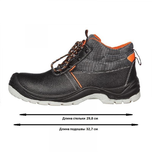 Ботинки рабочие Скорпион Премиум 1301ПК ПУ-ТПУ из натуральной кожи с композитным подноском чёрные (размер 45). Подходят для производственных и рабочих условий, где требуется высокая защита от механических и химических воздействий. Универсальная модель для различных условий эксплуатации.Верхняя часть ботинок изготовлена из натуральной кожи, обеспечивающей прочность и долговечность. Глухой клапан защищает от попадания внутрь влаги, пыли и мелких частиц, что повышает уровень комфорта и сохраняет внутреннее пространство обуви сухим. Объемная колодка специальной конструкции обеспечивает удобство при длительном ношении. Подносок выполнен из композитного поликарбоната, способного выдерживать удары силой до 200 Дж, что обеспечивает защиту пальцев ног.Подошва двухслойная: промежуточный слой из полиуретана обладает амортизирующими свойствами, снижает ударные нагрузки и придает обуви легкость, комфорт и теплозащиту. Ходовой слой выполнен из термопластичного полиуретана (ТПУ), который обладает высокой стойкостью к износу и деформациям, а также улучшенным сопротивлением скольжению. Подошва антистатичная и противоскользящая, что делает ботинки устойчивыми и безопасными на различных поверхностях. Метод крепления подошвы - литьевой.Особенности ботинок позволяют использовать их в производственных и промышленных помещениях с повышенными требованиями к защите от скольжения, химических веществ и механических повреждений. Защита от ударов, стойкость к маслам и бензину, а также амортизирующие свойства обеспечивают комфорт и безопасность при продолжительном использовании.Ботинки соответствуют стандартам безопасности, в том числе по ударопрочности и устойчивости к производственным загрязнениям. Композитный подносок дополнительно защищает от механических рисков.Стандарты: ГОСТ 12.4.137-2001, ГОСТ 12.4.033-95, ГОСТ 28507-90, ГОСТ Р 12.4.187-97, ТР ТС 019/2011. Рекомендуется для применения в производственных и строительных зонах, где важна защита от химических и физических воздействий. Гарантийный срок эксплуатации - 70 дней.