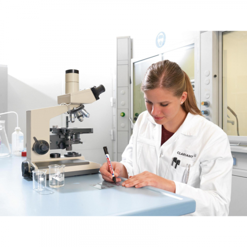 Маркер для использования в лабораториях (медицина, разработки и т.п.). Хорошо подходит для маркировки на гладкой и прозрачной поверхности, например, на предметном стекле, реакционном сосуде, лабораторной посуде, бирке и т.д. Надписи на пластике перманентные, а на стекле удаляются спиртосодержащими чистящими средствами. Маркировка сверхбыстросохнущая, не растекающаяся и четкая, водостойкая, светостойкая, слабопахнущая. Морозоустойчив до -183°С. Термостойкий (на алюминии до +500°С). Подходит для письма под острым углом (до 45 градусов).