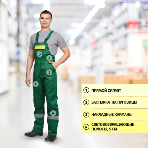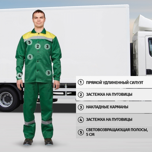 Спецодежда летняя костюмы летний мужской Механик состоит из куртки и брюк. Изготовлен из смесовой ткани плотностью 190 г/кв.м (80% полиэстер, 20% хлопок). Оснащен светоотражающими полосами. Куртка удлиненная, прямой силуэт, с двумя боковыми и одним нагрудным накладными карманами. Брюки имеют застежку гульфика на пуговицы, два накладных кармана. Размер костюма - 68-70, рост - 170-176. Сферы применения: сельское хозяйство, логистика, легкая промышленность, строительство, озеленение. Коллекция рабочей одежды л02 представлена комплектами: куртка с брюками л02-КБР и куртка с полукомбинезоном л02-КПК также в зеленом цвете с желтой отделкой.