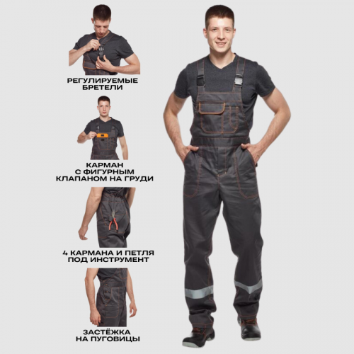 Костюм рабочий летний мужской л35-КПК с СОП серый/оранжевый (размер 48-50, рост 182-188) Костюм рабочий летний мужской модели л35-КПК представляет собой надёжное и удобное решение для работы в различных условиях. Его основное преимущество - высокое качество материалов и функциональный дизайн, обеспечивающие комфорт и защиту во время трудовых процессов. Костюм изготовлен из смешанной ткани с составом 65% полиэфир и 35% хлопок. Плотность материала составляет 200 г/кв.м. Эта комбинация обеспечивает прочность и удобство в носке. Масловодоотталкивающая отделка делает его устойчивым к воздействию масел и загрязнений. Защитные свойства: - Ми - защита от механических воздействий: истирания; - З - защита от общих производственных загрязнений. Тип силуэта куртки - полуприлегающий, обеспечивающий свободу движений. Регулировка по фигуре осуществляется с помощью кулисы по линии талии спинки. Есть дополнительные вентиляционные отверстия для комфортной циркуляции воздуха. Воротник отложной, застежка центральная потайная на пуговицы. Особенности куртки: - Карманы: два нижних кармана на полочке с клапаном, внутренний карман с нашивкой ФИО. - Рукава: двухшовные с притачными манжетами на пуговицы. - Сигнальные элементы: канты на полочке и спинке, световозвращающие принты. Полукомбинезон имеет прямой крой. Есть бретели с регулировкой длины на фастексы. Вентиляционные отверстия обеспечивают дополнительный воздухообмен. Особенности полукомбинезона: - Карманы: накладной карман на груди, фигурные накладные карманы на передних и задних половинках, внутренний карман. - Застёжка: молния в переднем шве. Рекомендуется стирать при температуре до 40C, использовать деликатный режим отжима, гладить при средней температуре. Не использовать отбеливатели, химчистку или гладильные прессы. Соответствует требованиям ГОСТ 12.4.280-2014 и ТР ТС 019/2011 для лёгкой промышленности. Коллекция рабочей одежды л35 представлена мужскими рабочими костюмами, выполненными в разных цветовых решениях.