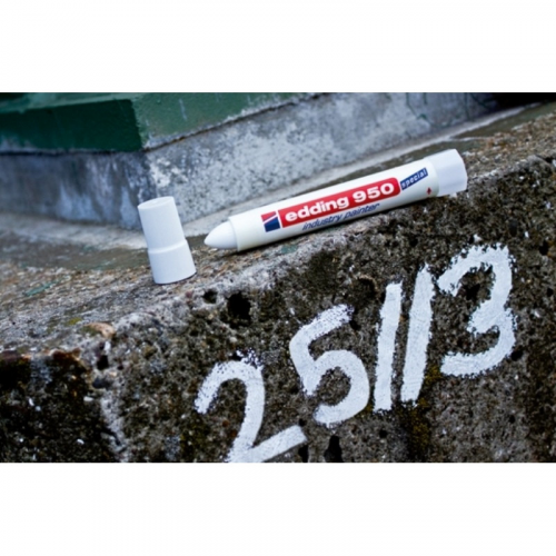 Маркер для промышленной графики Edding E 950 изготовлен на основе водостойкой пигментированной мастики, предназначен для нанесения постоянных, не удаляемых надписей на любые гладкие и шершавые поверхности. Идеально подходит для работ по следующим поверхностям: металлу, дереву, стеклу, картону, пластику, керамике и т. д. Маркер является универсальным, что позволяет маркировать такие поверхности, как влажное дерево, грязный, ржавый металл, пленки, кафель и многих других. Возможно использование по необработанному металлу, по бетону, кирпичу на строительстве, везде, где невозможно использовать маркер с фетровым наконечником. Надпись, нанесенная маркером Edding E 950, устойчива к выгоранию, к смыванию водой, истиранию механическим путем. Корпус промышленного маркера изготовлен из прочного пластика. В маркере Edding E 950 в качестве маркирующего вещества используется высокостойкая пигментная, плотно ложащаяся мастика. Мастика застывает через несколько секунд после ее нанесения на маркируемую поверхность. У фирмы Edding есть положительный опыт использования индустриального маркера Edding E 950 при проведении подводных работ. Благодаря водостойким свойствам мастики, данным маркером можно делать широкие, хорошо заметные надписи под водой и на предметах, длительное время находящихся в воде. Температурный режим нанесенной и высохшей краски маркера - до 300 °C. Температура поверхности при нанесении - не более 100 °C.