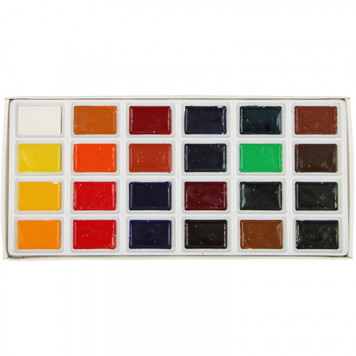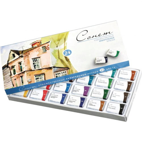 Краски акварельные Сонет набор 24 цвета по 2.5 мл в кюветах Художественные краски серии Сонет разработаны заводом Невская Палитра. Они предназначены для обучения живописному мастерству. Краски рекомендуются для выполнения эскизов, набросков, курсовых и дипломных работ. Продукт подходит как для начинающих, так и для опытных художников. Набор акварельных красок Сонет включает 24 цвета. В набор входят следующие цвета: белила цинковые, ганза лимонная, жёлтая средняя, жёлтая тёмная, охра золотистая, оранжевая, красная светлая, карминовая, краплак красный, английская красная, голубая, ультрамарин светлый, синяя, сине-зелёная, фиолетовая светлая, фиолетовая тёмная, изумрудная, травяная зелёная, зелёная тёмная, сиена натуральная, сиена жжёная, умбра жжёная, сепия, сажа газовая. Кюветы по 2.5 мл упакованы в картонную коробку с пластиковым поддоном. Коробка удобна для переноса и использования вне студии. Краски обеспечивают стабильность цвета и простоту использования. Продукт подходит для смешивания и получения новых оттенков. Высокая концентрация пигментов обеспечивает насыщенность цвета. Набор идеален для работы в студии и на пленэрах. Сбалансированная палитра включает наиболее популярные цвета. Законодательные и технические документы
