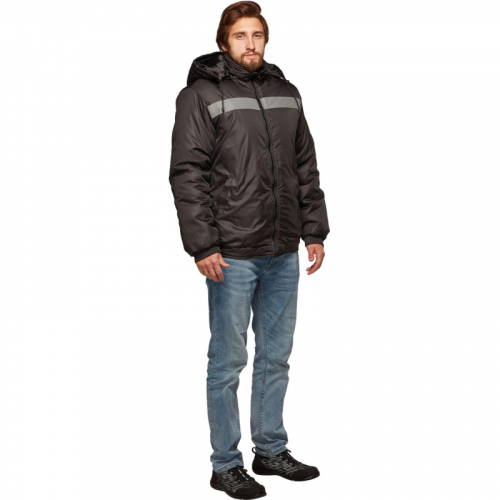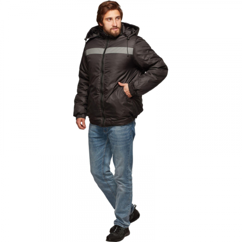 Куртка рабочая зимняя (куртка-бомбер) мужская с СОП черная (размер 52-54, рост 170-176). Рекомендуется для использования в ЖКХ, строительстве, пищевой и нефтегазовой отраслях. Изготовлено из 100% полиэстера. Плотность ткани: 80 г/кв.м. Подкладка: таффета (полиэстер). Утеплитель - синтепон плотностью 400 г/кв.м (основа) 2 слоя по 200 г/кв.м. и 200 г/кв.м (рукав) 1 слой. Защитные свойства: -Защищает от общих производственных загрязнений. - Защищает от пониженных температур. -Защищает от механических повреждений. Куртка прямого кроя. Светоотражающая полоса шириной 5 см расположена на груди. В районе талии есть два вместительных кармана. Есть также один внутренний карман. У куртки есть водоотталкивающая пропитка. Климатический пояс: III. Соответствует стандартам ГОСТ 12.4.303-2016, ТР ТС 019/2011.