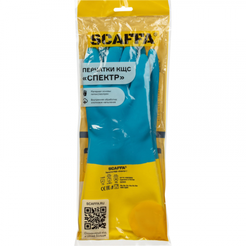 Перчатки КЩС латексные/неопреновые Scaffa Спектр желтые/синие (размер 11). Двухслойные герметичные латексные/неопреновые перчатки с надежной защитой широкого спектра химических веществ, обладают высокой стойкостью к моющим средствам. Неопреновая поверхность повышает механическую прочность, а так же сохраняет гибкость и эластичность в холодных условиях. Хлорированная поверхность повышает механическую прочность и уменьшает аллергическую реакцию на латексные белки. Текстура рабочей поверхности 'пчелиные соты' обеспечивает превосходное сцепление в сухом и влажном состоянии. Плотное хлопчатобумажное покрытие на внутренней поверхности выполнено для удобства надевания и использования, уменьшения аллергических реакций на белки латекса, а так же для комфортной теплоизоляции. Размер: 10-11, XXL. Тип манжеты: прямой. Соответствуют стандартам: ГОСТ 12.4.183-91, ГОСТ 12.4.252-2013, ТР ТС 019/2011, ГОСТ 12.4.220-2002, ГОСТ EN ISO 374-1-2016/Type A, ГОСТ ISO 374-5-2016, ГОСТ EN 388-2016. Количество пар в упаковке: 1. Количество единиц в транспортной упаковке: 120. Разрешен контакт с пищевыми продуктами на основании экспертного заключения в соответствии с едиными санитарно-эпидемиологическими и гигиеническими требованиями к товарам подлежащим санитарно-эпидемиологическому контролю №1277 от 04.07.2023.