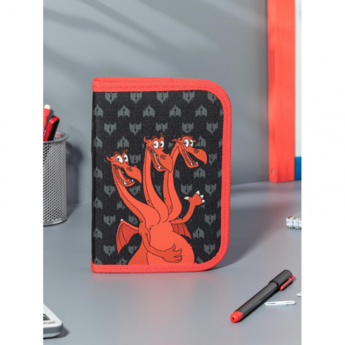 Пенал односекционный Комус Три богатыря Горыныч. Вместительное отделение для канцелярских принадлежностей застегивается на молнию. Изготовлен из полиэстера. Без наполнения. Размер: 19x2.5x13 см. Дизайн: персонаж из мультфильма "Три богатыря" - Змей Горыныч.