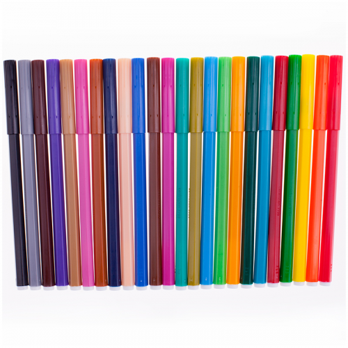 Набор фломастеров 24 цвета. Эргономичная зона обхвата. Безопасные для здоровья чернила. Не высыхают в течение 5 лет, смываемые, вентилируемый колпачок. Корпус шестигранной формы, корпус и детали изготовлены из полипропилена. Пулевидный пишущий узел, устойчивый к вдавливанию. Толщина линии - 1 мм.