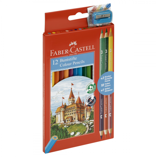 Набор цветных карандашей серии «Замок» от легендарного немецкого производителя Faber-Castell. Набор состоит из 12 карандашей шестигранной формы, 3 двусторонних карандашей круглой формы и точилки. 18 ярких цветов в наборе!