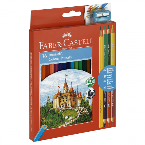 Набор цветных карандашей серии «Замок» от легендарного немецкого производителя Faber-Castell. Набор состоит из 36 карандашей шестигранной формы, 3 двусторонних карандашей круглой формы, 1 ч/г и точилки. 42 ярких цвета в наборе!