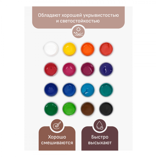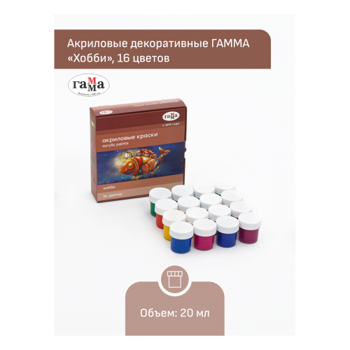 Акриловые краски серии «Хобби» предназначены для декоративно-оформительских работ и росписи бумаги, картона, холста, дерева, металла, гипса. Краски обладают высокой укрывистостью, хорошо смешиваются и быстро высыхают. После высыхания создают на поверхности глянцевый красочный слой. Акрил «Хобби» морозостиойкий, выдерживает транспортировку при низких температурах. Благодаря удобной герметичной баночке с завинчивающейся крышкой, краски долго хранятся, не высыхая. Объём одной баночки — 20 мл, общий объём — 320 мл.