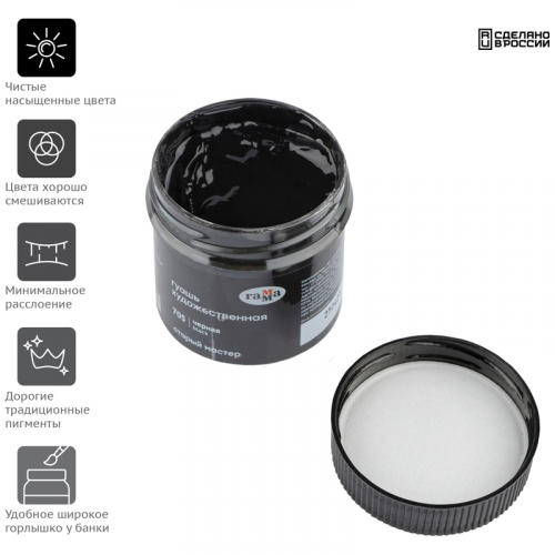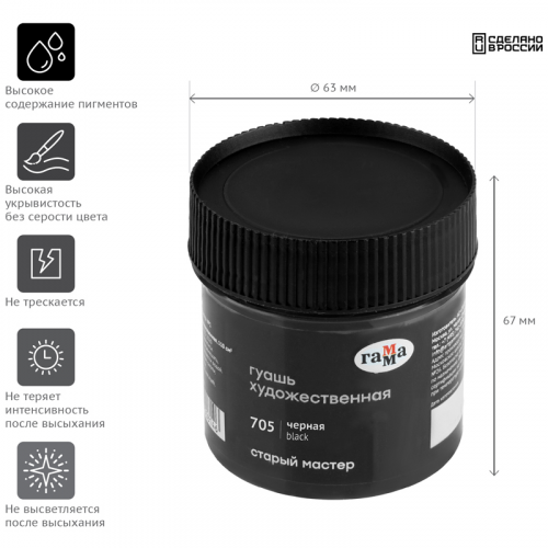 Гуашь художественная "Гамма" серии "Старый мастер" имеет уникальную рецептуру, разработанную в собственной исследовательской лаборатории завода совместно с художниками. Краски изготавливается из тонкодиспесных пигментов, связующего, в состав которого входит раствор растительного клея - гуммиарабика высшей степени очистки. Краска легко наносится на поверхность, благодаря специальным добавкам сохраняет яркость цвета после высыхания, создавая плотный бархатистый слой. Гуашь обладает высокой укрывистостью, отличной разносимостью, а также хорошо смешивается между собой. Большая часть цветов имеет самый высокий показатель светостойкости.