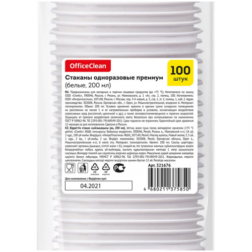 Стаканы одноразовые OfficeClean предназначены для холодных и горячих напитков. Имеют рифленые стенки, изготовлены из белого полипропилена. Объем - 200 мл. Максимальная температура использования +75° С. Верхний диаметр стакана - 70 мм, нижний диаметр стакана - 43 мм, высота - 95 мм. Вес - 3 гр. Одноразовые пластиковые стаканы широко используют для обеспечения быстрого питания в офисных столовых, образовательных и производственных учреждениях, предприятиях общественного питания.
