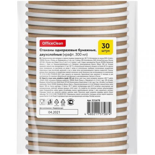 Стаканы одноразовые OfficeClean объемом 300 мл изготовлены из двухслойной ламинированной бумаги в дизайне крафт. Благодаря использованию в производстве натуральных материалов, стаканы являются безопасными для здоровья человека и его окружения. Они имеют достаточную плотность, чтобы дольше сохранить напиток горячим или холодным, при этом выдерживать температуру горячего кофе, шоколада или чая, не деформируются и не жгут руки.