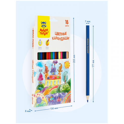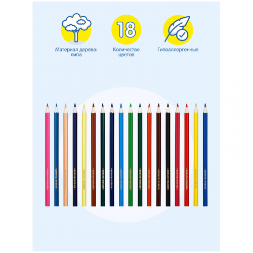 В наборе 18 цветов, диаметр грифеля составляет 3 мм, что увеличивает срок службы карандаша. Карандаши упакованы в картонную коробку с глянцевой ламинацией и европодвесом. Товар предназначен для детей старше 3-х лет.