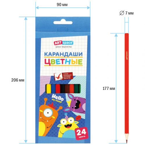 Цветные карандаши ArtSpace «Монстрики» с классическим шестигранным корпусом представлены в наборе из 24 цветов с уже заточенным мягким грифелем. Деревянные карандаши имеют яркие оттенки и легко затачиваются. Диаметр корпуса: 7 мм, диаметр грифеля: 2,65 мм, длина: 177 мм.
