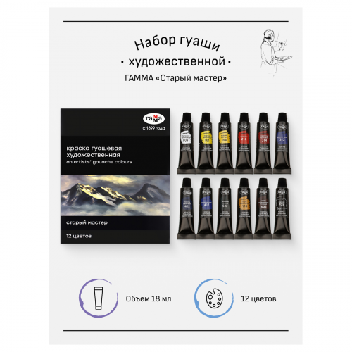 Гуашь художественная "Гамма" серии "Старый мастер" имеет уникальную рецептуру, разработанную в собственной исследовательской лаборатории завода совместно с художниками. Краски изготавливается из тонкодиспесных пигментов, связующего, в состав которого входит раствор растительного клея - гуммиарабика высшей степени очистки. Краска легко наносится на поверхность, благодаря специальным добавкам сохраняет яркость цвета после высыхания, создавая плотный бархатистый слой. Гуашь обладает высокой укрывистостью, отличной разносимостью, а также хорошо смешивается между собой. Большая часть цветов имеет самый высокий показатель светостойкости.