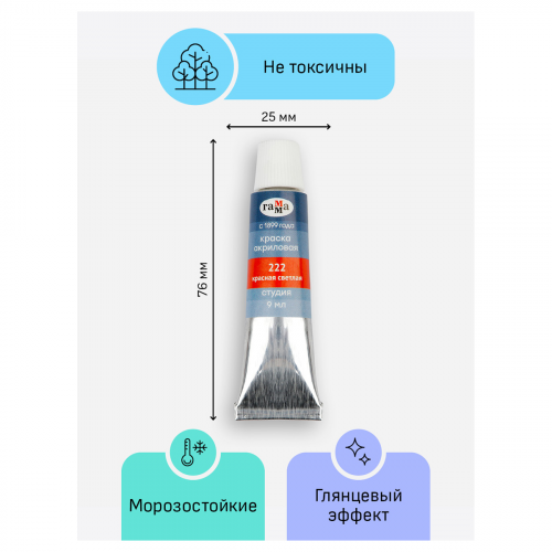 Набор новых акриловых красок ГАММА серии «Студия» предназначен для художественно-живописных и декоративно-прикладных работ. Объём тубы: 9 мл. Главные отличия: насыщенные цвета, высокая адгезия, прочность красочного слоя. После высыхания краски становятся глянцевыми, а специальная добавка позволяет максимально раскрыть красоту оттенков. Художественный акрил прекрасно разносится, подходит для бумаги, картона, грунтованного холста, дерева, стекла, кожи, ткани. Время высыхания: от 10 до 60 минут в зависимости от толщины слоя. Большая цветовая палитра, включающая в себя акриловые краски серебряного и золотого цветов.