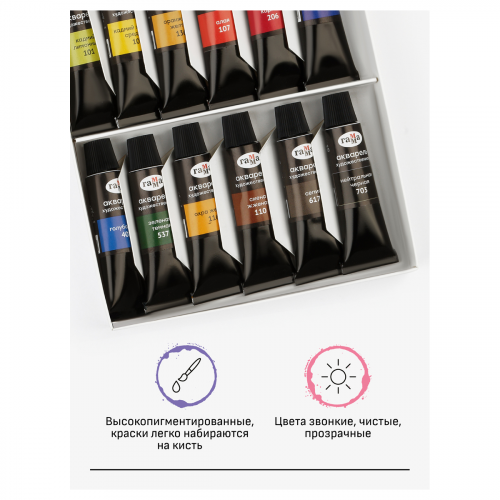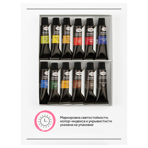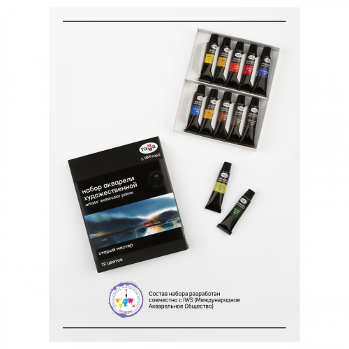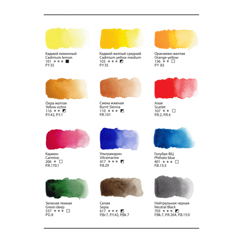Каждая кювета упакована в фольгу. На упаковке отображена информация о пигменте. Набор акварельных красок ГАММА «Старый Мастер» состоит из 12 базовых цветов в тубах 9 мл.
