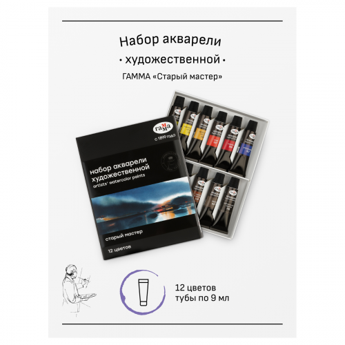 Профессиональная художественная акварель «ГАММА» серии «Старый мастер» разработана в собственной исследовательской лаборатории завода. Профессиональные краски состоят из тонкодисперсных пигментов, связующего, в состав которого входит раствор растительного клея - гуммиарабика высшей степени очистки, что обеспечивает насыщенность цветов, чистоту и прозрачность красочного слоя. Акварель «Старый мастер» изготавливается без использования дополнительных наполнителей, а многослойная заливка увеличивает долю пигмента. Краски обладают высоким уровнем светостойкости. С помощью акварельных красок «ГАММА» серии «Старый мастер» можно писать в различных техниках, например, - лессировка, по - мокрому, заливка, сухая кисть.