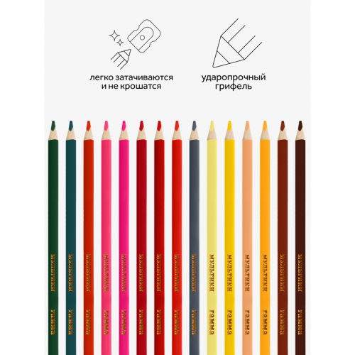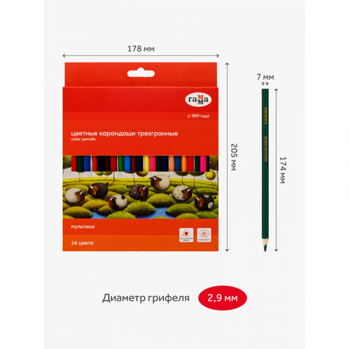 Цветные карандаши ГАММА серии «Мультики» выполнены в эргономичном трехгранном корпусе, который подскажет ребенку, как правильно держать инструмент во время творческих занятий. В наборе 24 цвета. Диаметр грифеля — 2,9 мм. Проклеенный ударопрочный грифель не крошится во время заточки и не ломается даже после падения. Корпус карандаша диаметром 7 мм и длиной 174 мм изготовлен из дерева. Специальная обработка древесины позволяет легко заточить карандаш без зазубрин и заноз. За яркость и высокую укрывистость отвечают качественные пигменты в составе. Ребенку не придется сильно давить на карандаш — рисунок получится ярким и равномерно закрашенным. Упаковка – картонная коробка с европодвесом. • Количество цветов: 24; • Форма корпуса: трёхгранная; • Заточка грифеля: да. • Количество карандашей: 24.