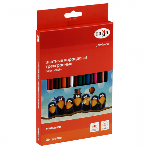 Цветные карандаши ГАММА серии «Мультики» выполнены в эргономичном трёхгранном корпусе, который подскажет ребенку, как правильно держать карандаш во время творческих занятий. В наборе 36 цветов. Диаметр грифеля – 3,3 мм. Проклеенный ударопрочный грифель не крошится во время заточки и не ломается даже после падения. Корпус карандаша длиной 174 мм изготовлен из дерева. Специальная обработка древесины позволяет легко заточить карандаш без зазубрин и заноз. За яркость и высокую укрывистость отвечают качественные пигменты в составе. Ребенку не придется сильно давить на карандаш – рисунок получится ярким и равномерно закрашенным. Упаковка – картонная коробка с европодвесом.
