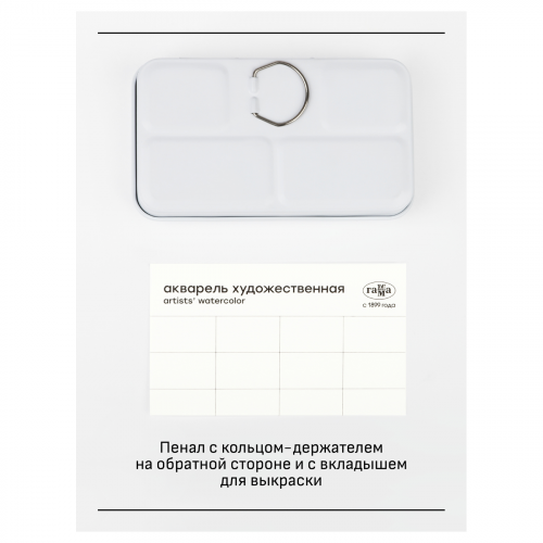 Набор представлен в металлическом пенале с удобными креплениями кювет, палитрой и кольцом-держателем на обратной стороне. Такой формат удобен для пленэра или студии. Иллюстрация для упаковки предоставлена Ильей Ибряевым.