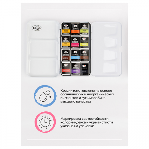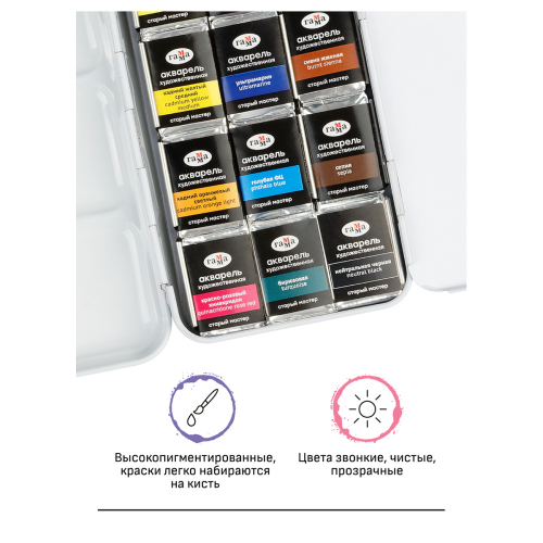 Профессиональная художественная акварель «ГАММА» серии «Старый мастер» разработана в собственной исследовательской лаборатории завода. Профессиональные краски состоят из тонкодисперсных пигментов, связующего, в состав которого входит раствор растительного клея - гуммиарабика высшей степени очистки, что обеспечивает насыщенность цветов, чистоту и прозрачность красочного слоя. Акварель «Старый мастер» изготавливается без использования дополнительных наполнителей, а многослойная заливка увеличивает долю пигмента. Краски обладают высоким уровнем светостойкости. С помощью акварельных красок «ГАММА» серии «Старый мастер» можно писать в различных техниках, например, - лессировка, по - мокрому, заливка, сухая кисть.
