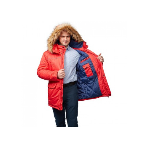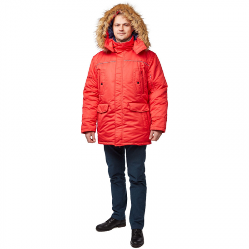 Куртка рабочая зимняя мужская Аляска з28-КУ со светоотражающим кантом красная (размер 60-62, рост 182-188). Рекомендована для использования в логистике, легкой промышленности, строительстве. Изготовлена из ткани "Таслан 330" (100% нейлон), плотность ткани - 130 г/кв.м. Утеплитель - холлофан плотностью 360 г/кв.м (основа) 3 слоя по 120 г/кв.м и 240 г/кв.м (руки) 2 слоя по 120 г/кв.м. Материал подкладки - 100% полиэстер. Защитные свойства: - Защищает от пониженных температур. - Защищает от общих производственных загрязнений. Куртка с центральной застежкой на молнию, ветрозащитным клапаном. Есть два нижних накладных и два верхних кармана на кнопках. Есть также два кармана на молнии. На капюшоне имеется отстегивающаяся меховая опушка. Куртка обеспечивает защиту от пониженных температур и производственных загрязнений. Соответствует ГОСТ 12.4.303-2016, ТР ТС 019/2011. В коллекции зимней спецодежды з28 представлены куртки-аляски з28-КУ красного, синего и черного цветов. К этим курткам подходят брюки з28-БР из этой же коллекции.