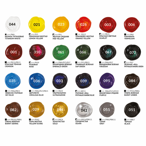 Краски с матовым финишем. Легко наносятся практически на любую поверхность. Яркие и насыщенные цвета. Быстро высыхают без изменения цвета. Обладают отличной укрывистостью и светостойкостью. Разбавляются водой. Не токсичны и не имеют неприятного резкого запаха. Краски в тубах объемом 5 мл поставляются в картонной коробке.