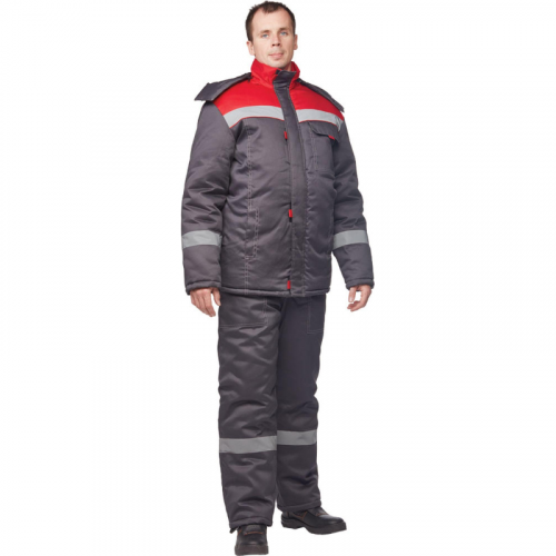 Костюм рабочий зимний мужской з31-КПК с СОП серый/красный (размер 44-46, рост 170-176). Рекомендован для использования в сельском хозяйстве, логистике, легкой промышленности, строительстве, озеленении. Изготовлен из смесовой ткани (65% полиэстер, 35% хлопок), плотность ткани - 210 г/кв.м. Утеплитель из синтепона, плотностью - 360 г/кв.м (основа) 3 слоя по 120 г/кв.м и 240 г/кв.м (руки/ноги) 2 слоя по 120 г/кв.м. Технология изготовления термоскрепленного синтепона (евросинтепона) позволяет использовать данный утеплитель для создания более тонких изделий с сохранением термозащитных свойств. Важными преимуществами утеплителя являются легкость и хорошая пластичность, что улучшает подвижность в костюме. А также исключение миграции волокна через ткани верха и подкладки за счет скрепления слоев. Материал подкладки - 100% полиэстер. Данная модель костюма предназначена для носки при температуре до -18°C. Защитные свойства: -Защищает от общих производственных загрязнений. -Защищает от пониженных температур. Светоотражающая полоса размещена на груди, спине, рукавах, а также внизу полукомбинезона. Куртка с центральной застежкой на молнию, ветрозащитным клапаном, съемным капюшоном, имеет два нижних внутренних кармана и один верхний накладной, трикотажные напульсники. Полукомбинезон классического покроя с центральной молнией, с двумя нижними накладными карманами. Стандарты: ГОСТ 12.4.303-2016. Костюмы, состоящие из куртки и полукомбинезона, из коллекции зимней спецодежды з31 представлены в нескольких цветовых сочетаниях: серый с контрастной отделкой красного цвета и синий, с аналогичной красной отделкой. размер Цвет на изображении товара в интернет-магазине или в печатном каталоге может отличаться от оригинала из-за особенностей цветопередачи монитора.