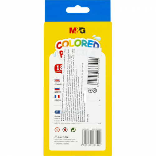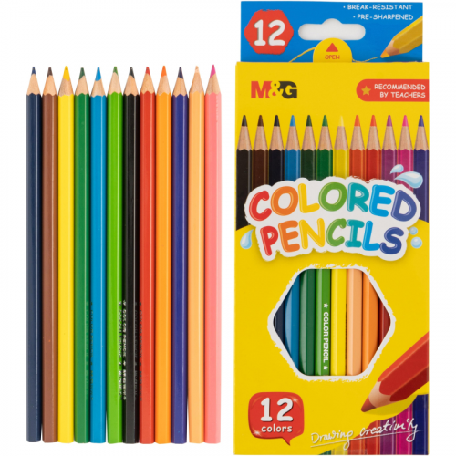 Карандаши цветные M&G 12 карандашей 12 цветов шестигранные (AWP34365) Карандаши цветные M&G предназначены для рисования, письма и раскрашивания на бумаге. Применяются детьми, студентами и взрослыми для творчества. Рекомендованный возраст от 3 лет. Набор содержит 12 цветов. Материал корпуса - древесина. Корпус шестигранный, диаметр: 7 мм. Длина корпуса: 178 мм. Диаметр грифеля: 2.8 мм. Грифель разноцветный. Карандаши заточены. Форма корпуса способствует правильному захвату пальцами. Упакованы в картонную коробку с европодвесом. Размер упаковки: 88x8x180 мм.