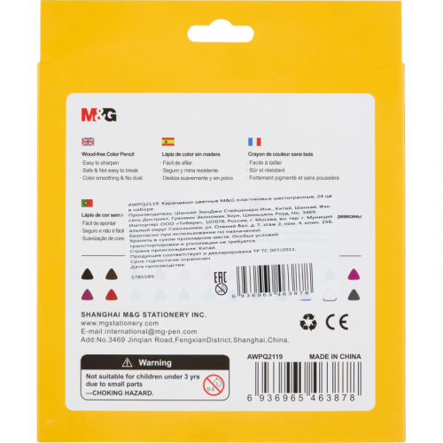 Карандаши цветные M&G 24 карандаша 24 цвета шестигранные (AWPQ2119) Карандаши цветные M&G предназначены для рисования на бумаге и картоне. Применяются в школах, детских садах, творческих кружках и дома. Рекомендованный возраст от 3 лет. Набор содержит 24 цвета. Материал корпуса - пластик. Корпус шестигранный, диаметр: 7 мм. Длина корпуса: 176 мм. Диаметр грифеля: 2.8 мм. Грифель разноцветный. Карандаши заточены. Форма корпуса обеспечивает удобство захвата. Упакованы в картонную коробку с европодвесом. Размер упаковки: 178x8x178 мм.
