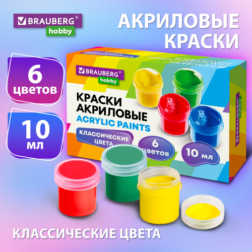 Краски акриловые для рисования и творчества 6 цветов по 10 мл, BRAUBERG HOBBY, 192432