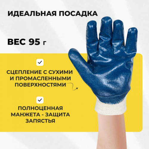 Перчатки рабочие защитные Scaffa NBR1515 хлопковые с нитрильным покрытием белые/синие (размер 9 (L)). Предназначены для защиты рук от механических повреждений. Основной материал - трикотажная ткань джерси, манжет и часть поверхности покрыты нитрилом. Перчатки рекомендуется использовать для обработки грубых поверхностей, сборки и обслуживания оборудования, складских операций и строительных работ. Перчатки обеспечивают высокую защиту и комфорт при длительном использовании. Защитные свойства соответствуют стандарту EN 388-4111X: - Стойкость к истиранию: уровень 4 (не менее 8000 циклов).- Стойкость к разрыву: уровень 1 (не менее 10 Н).- Стойкость к порезу: уровень 1, индекс не менее 1,2.- Стойкость к проколу: уровень 1 (не менее 20 Н).Перчатки соответствуют стандартам ТР ТС 019/2011, ГОСТ EN 388-2016, ГОСТ 12.4.103-2020. Длина изделия - 250 мм. В упаковке 1 пара.ЗАКОНОДАТЕЛЬНЫЕ И ТЕХНИЧЕСКИЕ ДОКУМЕНТЫ: