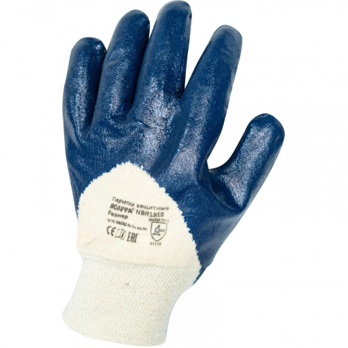 Перчатки рабочие защитные Scaffa NBR1515 хлопковые с нитрильным покрытием белые/синие (размер 10 (XL)). Предназначены для защиты рук от механических повреждений. Они используются для работ с грубыми поверхностями, сборки и обслуживания оборудования, складских операций и строительных работ. Основа и манжет изготовлены из трикотажной ткани джерси, частично покрыты нитрилом. Такой состав обеспечивает прочность и долговечность изделия, а также повышенные защитные характеристики.Перчатки соответствуют стандарту EN 388-4111X: - Стойкость к истиранию: уровень 4 (не менее 8000 циклов).- Стойкость к разрыву: уровень 1 (не менее 10 Н).- Стойкость к порезу: уровень 1 (не менее 1,2).- Стойкость к проколу: уровень 1 (не менее 20 Н).Перчатки соответствуют стандартам ТР ТС 019/2011, ГОСТ EN 388-2016, ГОСТ 12.4.103-2020. Длина изделия - 260 мм, размер 10. В упаковке 1 пара.ЗАКОНОДАТЕЛЬНЫЕ И ТЕХНИЧЕСКИЕ ДОКУМЕНТЫ: