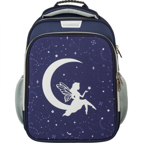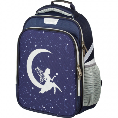 Ранец для девочки прямоугольной формы. Жесткий каркас. Анатомическая спинка. Ранец имеет два отдела на молнии. В основном отделении - гибкая перегородка, предназначенная для удобного хранения книг и тетрадей, и прозрачный карман с вкладышем для расписания уроков. Во втором - сетчатый карман и карман-органайзер. Дышащая спинка. Ранец оснащен двумя ручками: одна узкая, чтобы вешать на парту, вторая широкая и мягкая, чтобы удобно носить в руке. Широкие удобные лямки из воздухообменного сетчатого материала регулируются по длине и по спинке ранца - удобно подогнать под рост ребенка, что позволяет добиться наиболее комфортного расположения ранца на спине. Благодаря устойчивому дну и ножкам ребенку будет удобно находить нужные учебники и тетради. Боковые карманы-сеточки для бутылки и прочих аксессуаров. Плотное дно удерживает форму. Грудная застежка помогает лучше зафиксировать ранец на теле и снять часть нагрузки с плеч. Для безопасности ребенка в темное время суток предусмотрены светоотражатели на передней части ранца, на лямках и над боковыми карманами. Особенности: мигающие светодиодные лампочки в звездах, которые включаются от легкого постукивания по крышке ранца. Имеет 4 режима мигания. Размер: 290x145x360 мм.