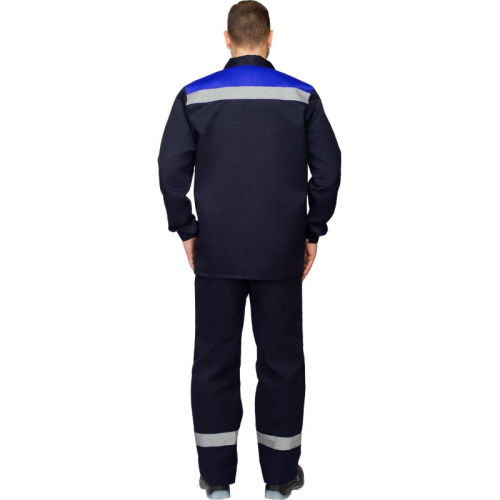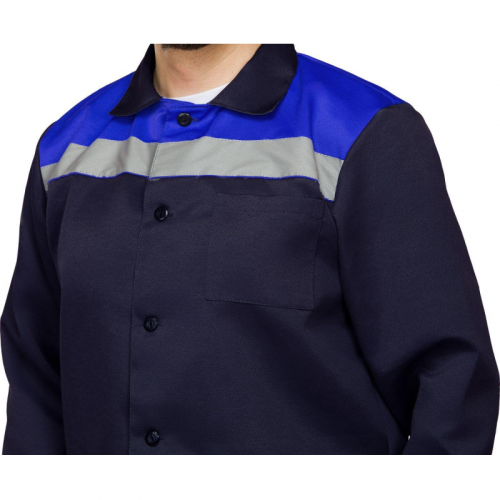Костюм рабочий летний мужской л16-КБР с СОП синий/васильковый (размер 60-62, рост 194-200) Костюм рабочий состоит из куртки и брюк. Он предназначен для использования в сферах логистики, строительства, сельского хозяйства, лёгкой промышленности и озеленения. Костюм обеспечит комфорт и безопасность при работе в условиях плохой видимости и повышенной опасности, таких как работа вблизи техники или на открытых площадках. Ткань основная: смесовая (80% полиэстер, 20% хлопок), плотность 190 г/кв.м. Материал обладает водоотталкивающими свойствами, устойчив к истиранию и механическим повреждениям. Защитные свойства: - Ми - защита от механических воздействий: истирания; - З - защита от общих производственных загрязнений. Куртка имеет удлинённый прямой силуэт, который не стесняет движения, что делает её удобной для работы в различных сферах. Центральная застежка на петлях и пуговицах, воротник отложной. На куртке предусмотрены три накладных кармана для удобства хранения различных предметов, один нагрудный накладной, два нижних накладных. Рукава втачные одношовные. Регулировка ширины манжет рукава при помощи пуговиц. По спинке и полочкам отрезные кокетки из отделочной ткани. Световозвращающая лента шириной 50 мм расположена по кокеткам полочки, спинки. Брюки выполнены в прямом силуэте. Застежка гульфика брюк на петлях и пуговицах, пуговица по поясу. На поясе расположены шлевки для ремня. На брюках расположены два накладных кармана с наклонным входом. Световозвращающая лента шириной 50 мм настрочена по низу брюк. Модель соответствует требованиям ГОСТ 12.4.280-2014 и ТР ТС 019/2011. Коллекция спецодежды л16 представлена комплектами куртка-брюки л16-КБР и куртка-полукомбинезон л16-КПК. В связи с особенностями технологии выкраса ткани в изделии могут наблюдаться различия в цвете отдельных элементов.