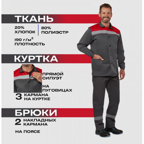 Костюм рабочий летний мужской л16-КБР с СОП серый/красный (размер 64-66, рост 182-188) Костюм рабочий состоит из куртки и брюк. Он предназначен для использования в сферах логистики, строительства, сельского хозяйства, лёгкой промышленности и озеленения. Костюм обеспечит комфорт и безопасность при работе в условиях плохой видимости и повышенной опасности, таких как работа вблизи техники или на открытых площадках. Ткань основная: смесовая (80% полиэстер, 20% хлопок), плотность 190 г/кв.м. Материал обладает водоотталкивающими свойствами, устойчив к истиранию и механическим повреждениям. Защитные свойства: - Ми - защита от механических воздействий: истирания; - З - защита от общих производственных загрязнений. Куртка имеет удлинённый прямой силуэт, который не стесняет движения, что делает её удобной для работы в различных сферах. Центральная застежка на петлях и пуговицах, воротник отложной. На куртке предусмотрены три накладных кармана для удобства хранения различных предметов, один нагрудный накладной, два нижних накладных. Рукава втачные одношовные. Регулировка ширины манжет рукава при помощи пуговиц. По спинке и полочкам отрезные кокетки из отделочной ткани. Световозвращающая лента шириной 50 мм расположена по кокеткам полочки, спинки. Брюки выполнены в прямом силуэте. Застежка гульфика брюк на петлях и пуговицах, пуговица по поясу. На поясе расположены шлевки для ремня. На брюках расположены два накладных кармана с наклонным входом. Световозвращающая лента шириной 50 мм настрочена по низу брюк. Модель соответствует требованиям ГОСТ 12.4.280-2014 и ТР ТС 019/2011. Коллекция спецодежды л16 представлена комплектами куртка-брюки л16-КБР и куртка-полукомбинезон л16-КПК. В связи с особенностями технологии выкраса ткани в изделии могут наблюдаться различия в цвете отдельных элементов.