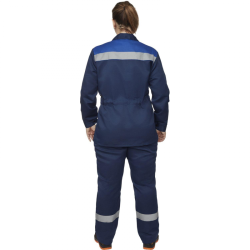 Костюм рабочий летний женский л16-КПК с СОП синий/васильковый (размер 52-54, рост 170-176 см). Куртка застегивается на пуговицы с потайной застежкой, по линии талии размещена регулируемая кулиса. Оснащен световозвращающей полосой шириной 5 см. Костюм изготовлен из смесовой ткани плотностью 190 г/кв.м. с водоотталкивающей пропиткой (20% хлопок, 80% полиэфир). Размер 52-54, рассчитан на рост 170-176 см. Сферы применения: сельское хозяйство, логистика, легкая промышленность, строительство, озеленение. Коллекция спецодежды л16 представлена женскими комплектами куртка и полукомбинезон л16-КПК-жен, а также мужскими брюками л16-БР, полукомбинезонами л16-ПК.
